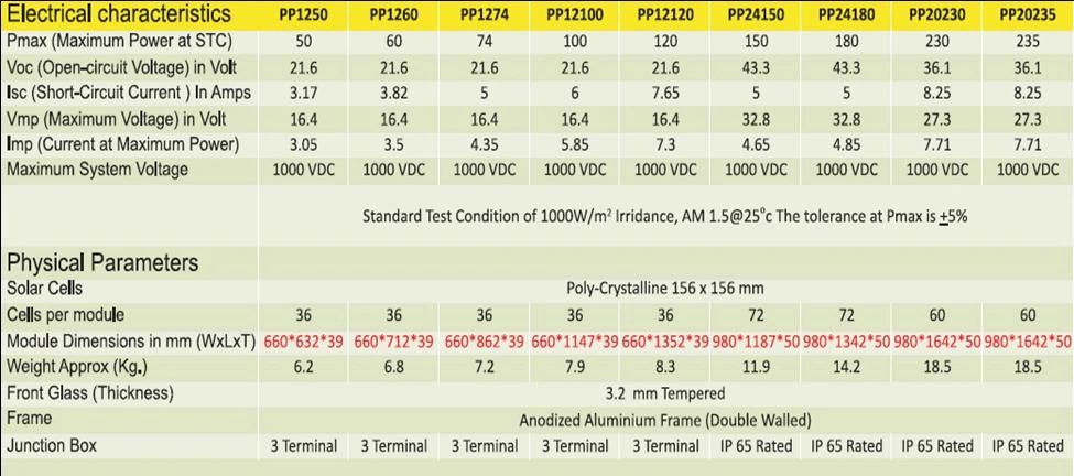• Modules in the Power class of 3 wp to 330 wp with 240wp family for 60 cells Modules and 280wp family for 72 cells.
